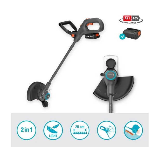 Ελαφρύ, στιβαρό και έτοιμο να δώσει το ιδανικό φινίρισμα στον κήπο σας. Γνωρίστε το Χορτοκοπτικό Μπαταρίας Gardena EasyTrim 25/18V P4A, το χορτοκοπτικό μπαταρίας 2 σε 1. Χρησιμοποιεί μπαταρία 18V POWER FOR ALL (πωλείται χωριστά), και παρά το βάρος των μόλις 1,7 κιλών (2,1 με την μπαταρία), αυτό το χειροκίνητο τρίμερ παρέχει ισχυρή κοπτική απόδοση με τόξο κοπής 25 cm και μεσινέζα αυτόματης τροφοδοσίας 1,6 mm.