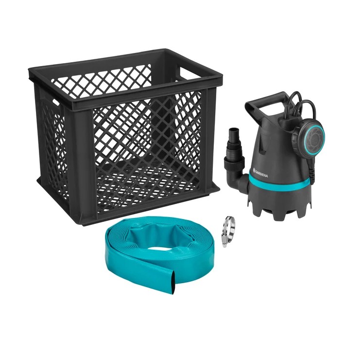Αντλία Αποστράγγισης Gardena BASIC 10500 για Ακάθαρτα Νερά με σετ επίπεδου λάστιχου και πρακτικό κουτί αποθήκευσης.